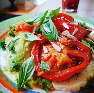 1. For any soupy, roast veggie chillis, bakes-combo's add a spoonful houmous, peanut butter or yoghurt sprinkled with ground coriander, chilli, sea salt, basil, drizzle of virgin olive oil.